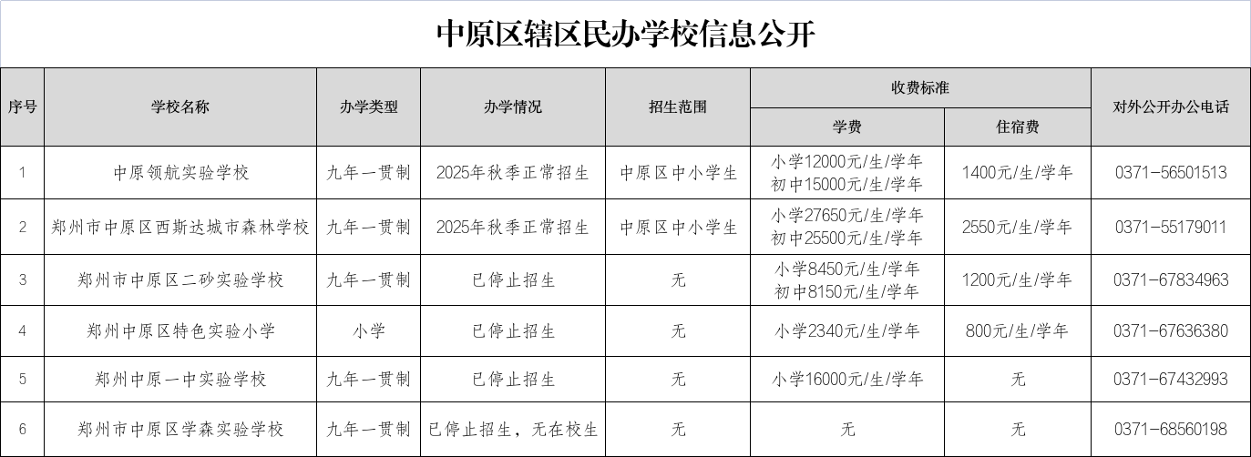 | 1 | 中原领航实验学校 | 九年一贯制 | 2025年秋季正常招生 | 中原区中小学生 | 小学12000元/生/学年 初中15000元/生/学年 | 1400元/生/学年 | 0371-56501513 |